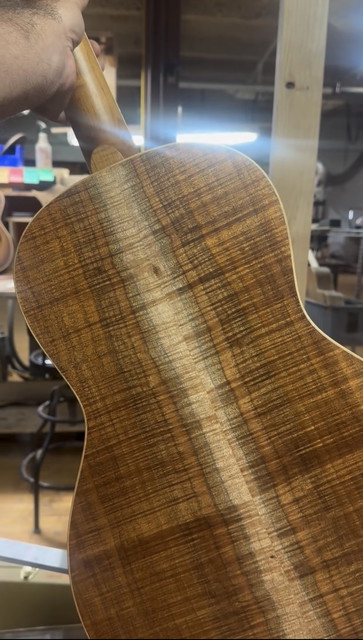 The first resonator I ever saw in person was an all koa dobro made by John Reuter, Director of training at the Roberto Venn School of Luthiery. 23 years later, this all koa Mule is for him. Attending RV is one of my favorite life experiences and in the cast of characters that run the school John is the “football coach.” John is known for his tough love, his memorable sayings like “it’s a beautiful thing”, and for having an absolutely badass stash of wood.