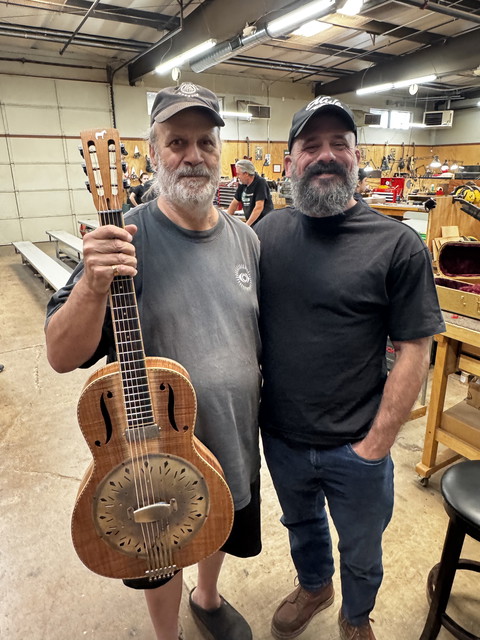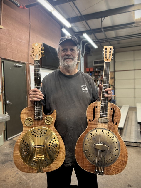 I made a resonator for the man who made the first resonator I ever saw - John Reuter, the director of training at the Roberto Venn School of Luthiery. He’s holding that prophetic instrument from 22 years ago along with his Parr Mule. His first words after spending a night with it were “Holy shit!” Career made.
